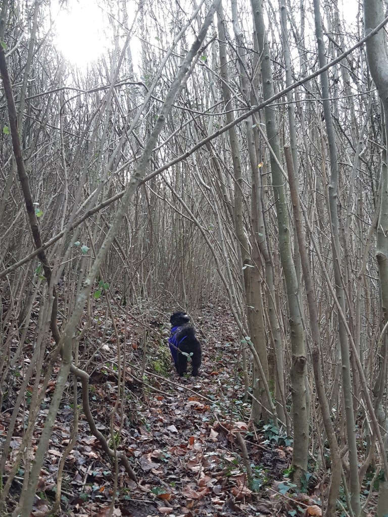 Firstly, there was no stand of birches. What there was, was a scrub of fallen birch brash which had been repurposed into a rough hurdle fence, and then a stand of very dense saplings, which at first I couldn’t identify. This felt disorientating, disappointing, and slightly shameful – here was I, tree lady, getting it so very wrong. The paths in were very slight, and I made my way along slowly, like a badger or a deer, sometimes on all fours, following Fen who trotted ahead.