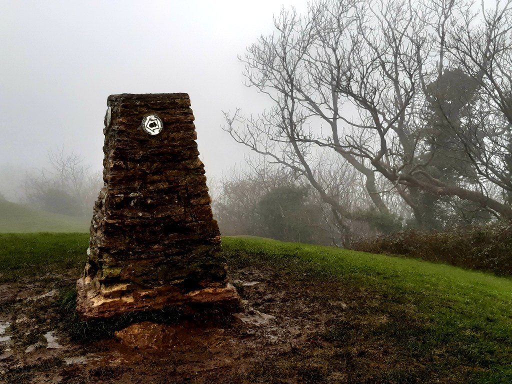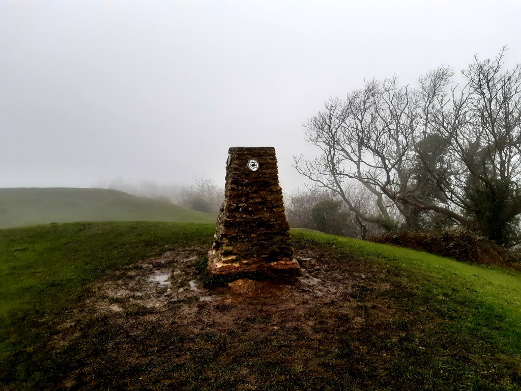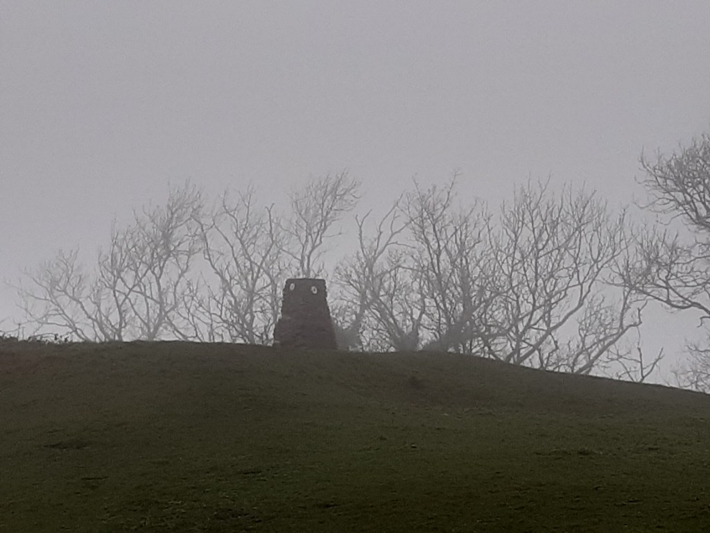 We reached the trig, which looked eldritch in the mist. Lichen draped the stunted, stubby hawthorns, highlighted here and there with a splash of bright mistletoe. On the approach, the trig gradually appeared at the peak, bemisted tree skeletons behind, and its pathways markers looked like eyes, as if it watched our drawing near. It is fascinating, how such a recent monument can carry such an air of age and otherness. They are squat, lumpen, but with such sharp lines and a strange flattened effect to their dimension. I circled it, approached it. I was aware that my friends were planning to libate the Bisley trig, read poetry to it. Like the shepherd boy in Rosetti’s carol, I had nothing to offer – nothing had suggested itself as appropriate. But as ever, once on site the inspiration solution came – and we three howled our howls like wolves, hidden in the mist, a mum and her two cubs and a pup. It felt so good, to open our throats and sing wolf to the grey skies!