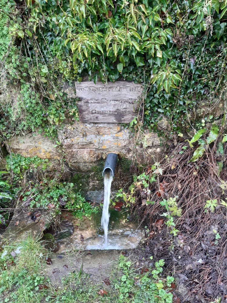 I had not seen the view towards town from this side of the valley, and I spent some time enjoying the change in perspective as I approached the elevated heart of Ruscombe proper, with its cottages improbably wedged into the side of the hill, higgledy-piggledy. I found the village spring, and took a welcome draught – I had forgotten to bring a drink of my own. Above the spring there was a hand carved, simple wooden plaque, its message be-mossed and water stained. Expecting to find a wise religious homily I struggled to read it until I traced the letters with my pencil. What it said was this:
