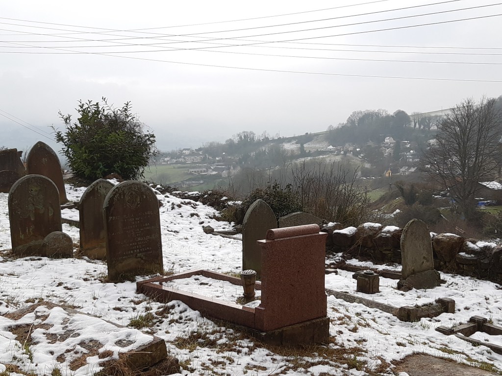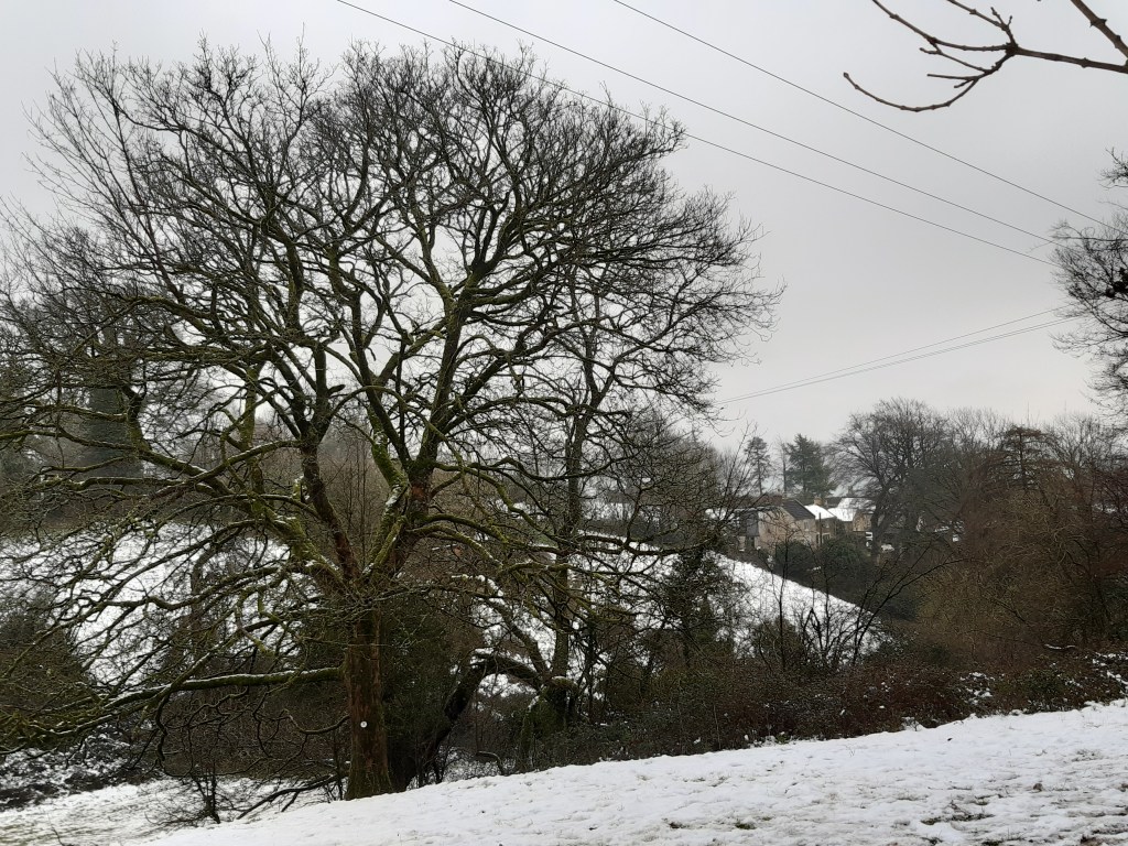 I walked up to the wonderfully named head of the valley, The Throat, describing an almost perfect bell curve of road, and wandered into the little churchyard there, before retracing my steps up the very steep Zion Hill and into the woods. The path levelled out following a low stone wall boundary and passing through stone gateposts. Coming out onto a small, sloping open area covered in snow I paused, listening to the low of cattle and the steady drip of melting snow from the hedgerow – bramble, haw, old mans beard. It was noticeably colder this high up, a wintery microclimate.