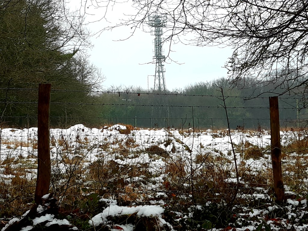 I had been casting more silver threads as I walked, and now turned and faced the direction of my house and cast even more, a strange weaving fisherwoman not looking for a catch. Often, transmitters, pylons and their ilk feel eerie. This one felt friendly. Feeling oddly warmed, and also satisfied with a successful hunt, I crossed the very old-looking road into Standish woods and set out for the burial mound. On the way, I found much better views of the transmitter.