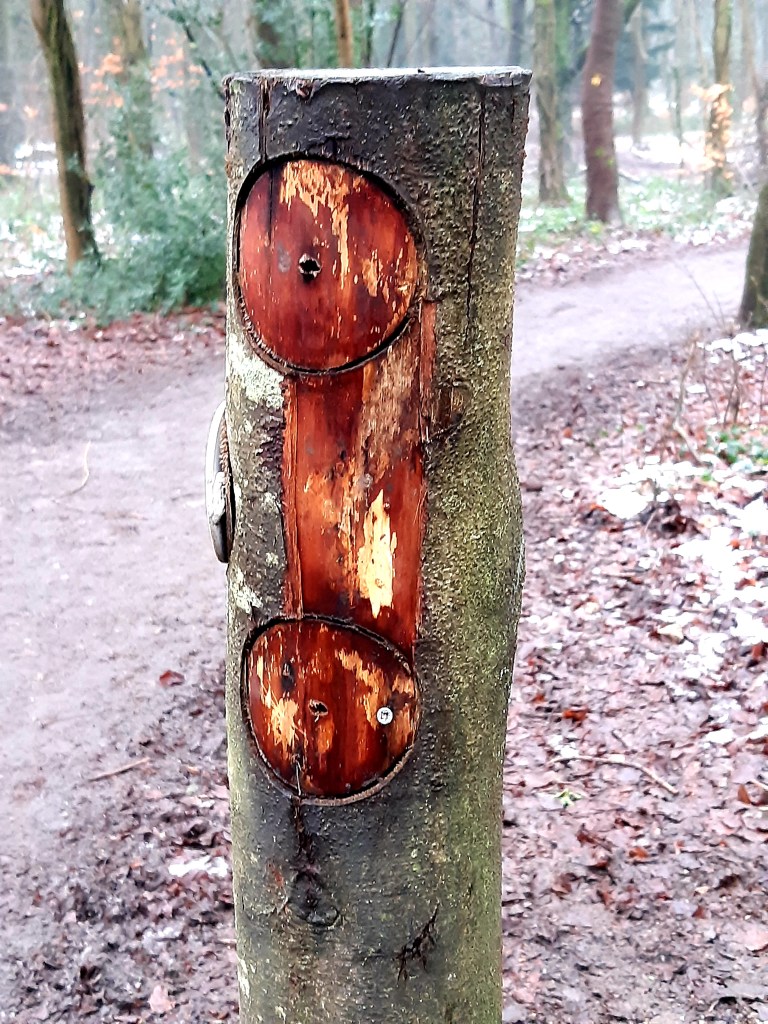 I continue with the remainder of the walk, playing with the idea that everything we meet is important. I come to a beech tree emblazoned with a bright pink arrow pointing down and to the left, and I decide to take it as an instruction and follow it along snowmelt paths in the dark sodden carpet of fallen leaves and mud. The colours are so strong – white and dark brown and green-grey and copper.