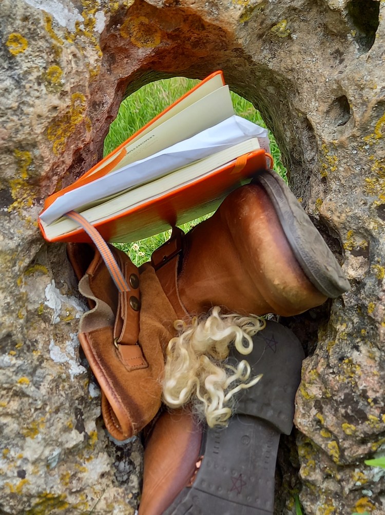 I then take my belongings from the point where they rest in the hole in the stone, neither here nor there, through to the otherside so they arrive back with me, through that liminal portal, now consecrated by The Wanderers as symbolic of all the Boots, all the Notebooks and Pens, all the Things I shall ever wear, have and make.