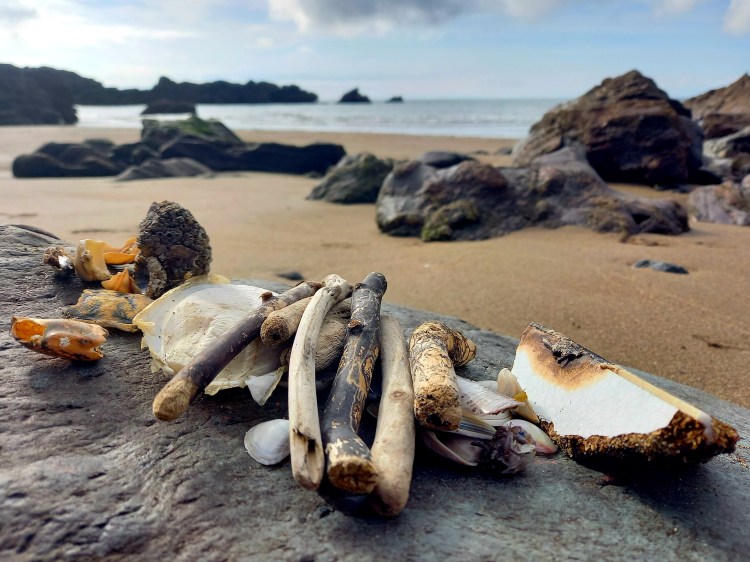 I wander down to Sharrow Beach. It is deserted, though crisscrossed with human and dog footprints. In 1874 (there seems to be some confusion over the date, with a transcription error sometimes stating 1784) a small cave was excavated here by hand by a hermit called Lugger, who inscribed verses on the ceiling to relieve his boredom. Sadly this is walled off to the public, so I can’t read his words. It’s lovely here, but unexpectedly, I find I’m not in the mood for beaches, and to be honest they are all a steep walk down and therefore back up, and I’m already walking quite a long way by my lights. But it is lovely to experience this level of quietness on a beach in Cornwall, even on a glorious and warm day, and I manage to find a few pleasing objects in the short time I’m there.