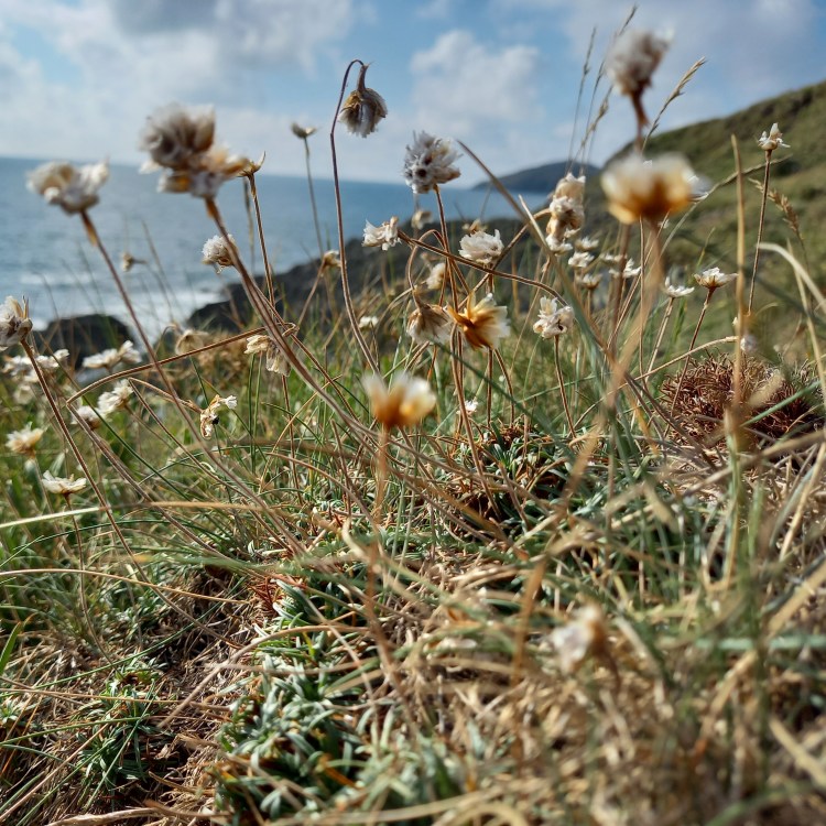 Thrift is a much better name than the more prosaic ‘sea pink’ and they are indeed thrifty beings, surviving exposed to all elements requiring minimal resource on the barest of salty soils. I am also drawn to the firework explosions for what I think are will carrot – some umbelliferous anyway, a bit smaller than I’m used to growing here on the edge of the Sound. Together they work well, and I collect some, with a vague idea of ‘seed orbs’ growing in my mind for making later.