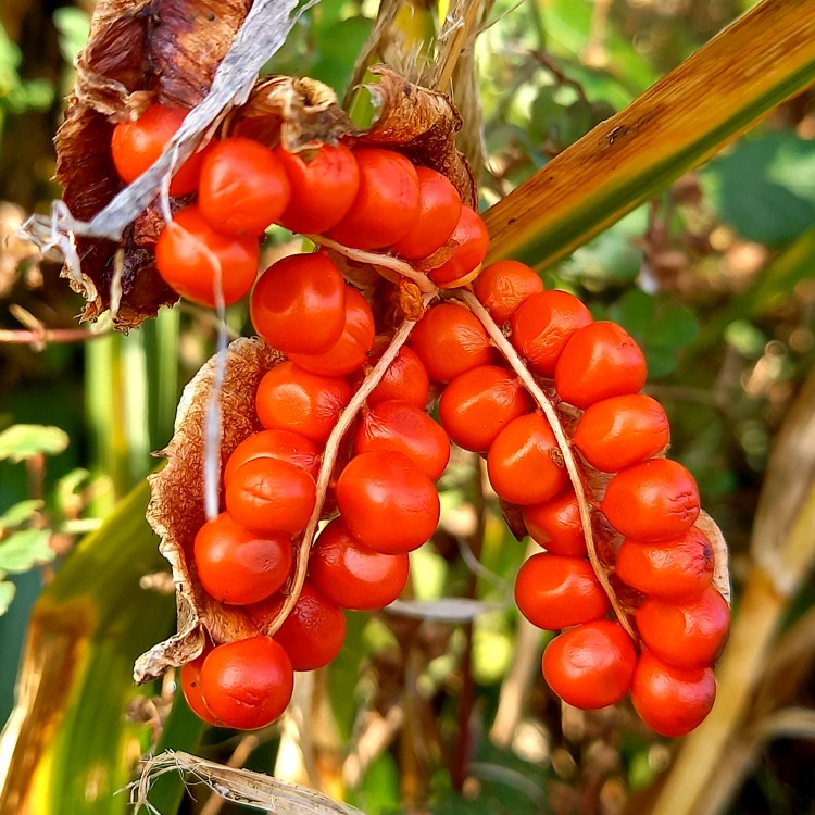 On the way back I stop to look back at the chapel, silhouetted against the descending sun. I haven’t seen it from this side before, and I am struck by the Pythagorean precision of the angle of the slope leading into the sea; a set square example of the Freemason’s Maker’s perfection. I see a triangulation of stink lily berries, sitting snug in their brown leafy beds; garlands of bryony lace the hedgerows, all colours from green through yellow-amber-orange to a rich, bright, poisonous jewel red. A traffic light plant.