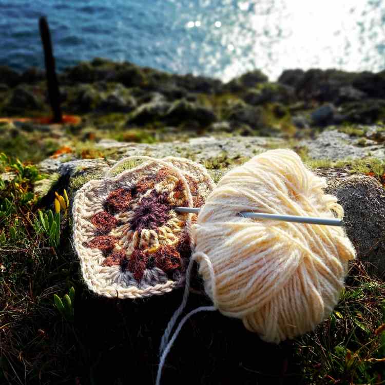 I don’t spend much time at the chapel itself, it’s a bit busy and my mission today is to go beyond it and down onto the slopes of the cliff. They are full of jagged, pale grey rocks, bright orange and green lichens, and the fluffy, crispy dried heads of sea pink, or thrift. This was where I wanted to be today, and I get out my well-travelled ‘edgelands crochet’. It has travelled from the shores of the Severn to the edge of the sea, here. I may need to take it to some more ethereal edge lands, wastelands and wildernesses.