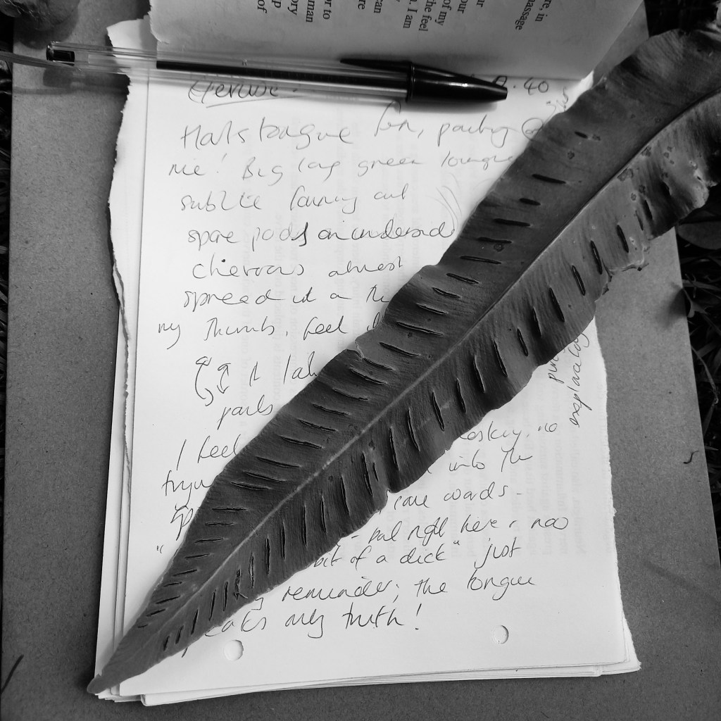 The minute I stop explaining the exercise and start looking around, a harts tongue fern leaps into my forevision. It is so green, and so vivid, it is cartoonish. The tip of its’ tongue seems to point right at me – right between the eyes – and almost beckons me to it; a sorcerer’s apprentice, the corner of Dr Strange’s sentient cape. I can’t refuse such a summons,