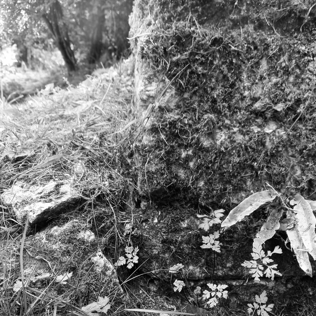 I find a lovely herb Robert, pungent and red-stemmed growing from a crack in the stone wall of an old cattle byre. I’ve allowed my eyes to scan my immediate horizon lazily, through hooded lids, until I hear a call ‘Bravesoul!’ I get up close and low down with this herb Robert, and have a huge desire to put a leafy frond in my right ear. Pushing aside a quick stab of ‘shouldn’ts’ I do exactly this.